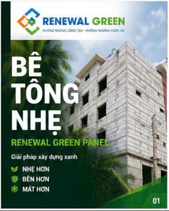 Công ty TNHH Vật Liệu Tái Tạo Năng Lượng Xanh hay còn gọi là Renewal Green là công ty nhà sản xuất bê tông nhẹ CLC, EPS, gạch bê tông nhẹ, tấm panel bê tông nhẹ và chuyển giao dây chuyền máy sản xuất bê tông nhẹ và cung cấp phụ gia bê tông.